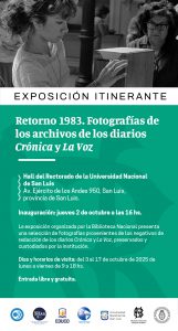 Retorno 1983. Fotografías de los archivos de los diarios Crónica y La Voz se puede visitar del 3 al 17 de octubre de lunes a viernes de 9 a 18 hs. en el Hall del Rectorado de la Universidad Nacional de San Luis, Av. Ejército de los Andes 950, San Luis, provincia de San Luis.